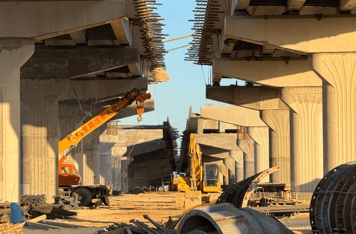 Reinforced concrete bridge works with strength up to 480 kg/cm², installation of expansion joints, and concrete insulation for moisture and salt protection.